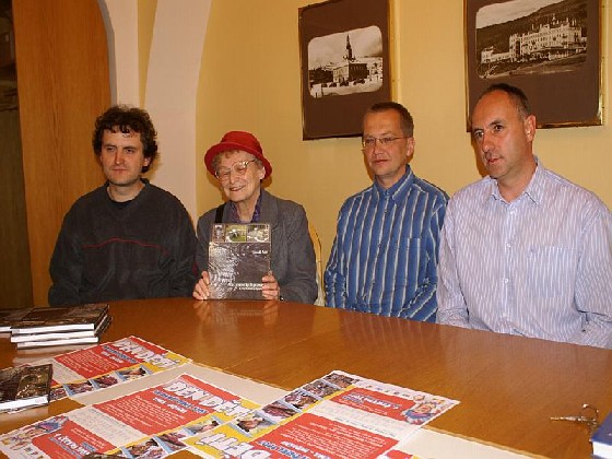 Po více než dvouleté přípravě se na pultech knihkupectví a vybraných obchodů objevila zajímavá publikace vydaná Hnutím Brontosaurus Jeseníky. Na snímku zleva šéf Brontosaurů Tomáš Hradil, babička autora knihy Lukáše Abta Milada Milatová, technický otec knihy Tomáš Knopp a kmotr knihy starosta Jeseníku Petr Procházka.