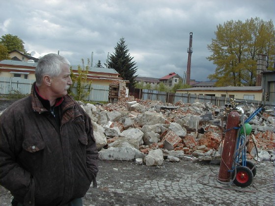 Ředitel Technických služeb Jeseník, a.s. obhlíží zbytky garáží ČSAD v Jeseníku, které nahradí nový supermarket LIDL. Má se tak stát už vletos v září a technické služby jsou subdodavatelem stavební části.